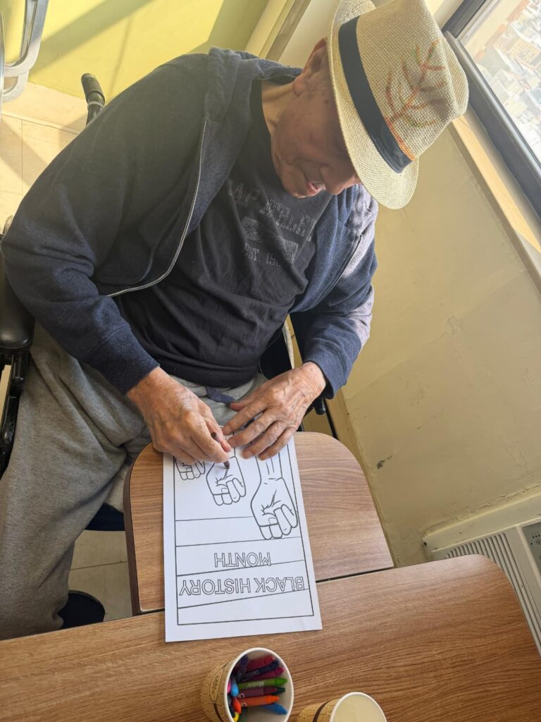One of the meaningful activities we held was in recognition of Black History Month. During this activity, residents participated in creative and reflective exercises that honored the history, resilience, and achievements of Black individuals who have shaped society. Residents worked on themed coloring and discussion activities that encouraged them to reflect on important historical contributions and share their own stories and experiences.