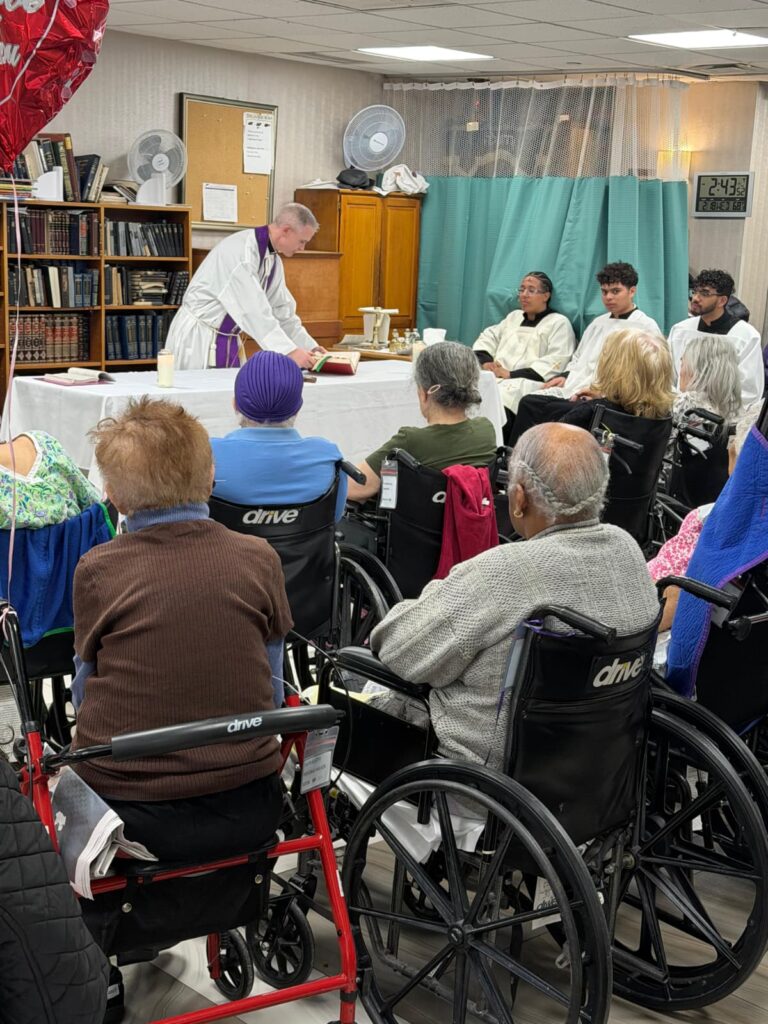 The clergy opened the service with prayer and scripture, speaking about renewal, faith, and the importance of reflection. Hymns were sung softly, with many residents joining in, their voices blending together in a comforting and familiar way. The presence of the altar, candles, and sacred vessels created a peaceful and sacred atmosphere right within our activity space.